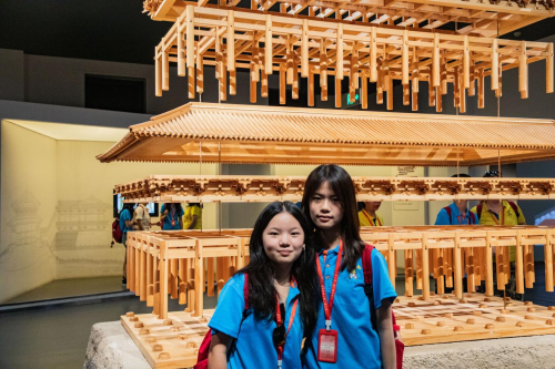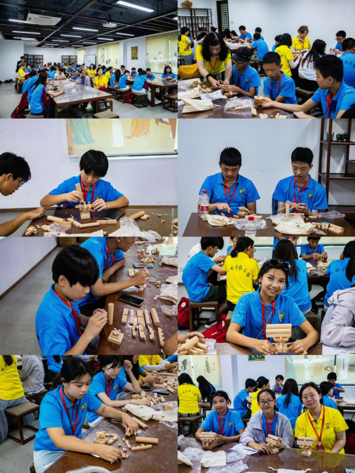 “宫殿的斗拱缘何而来?又如何拼接到一起的?”带着对大明宫古建的种种疑问,营员们随后来到大明宫书院,化身“大唐工匠”跟随研学老师走进唐朝古建小课堂。“斗拱,上承屋顶,下接立柱,托举而起的千宫飞檐惊艳世界千年……”课堂上,老师通过展示建筑模型,带大家走进博大精深的斗拱世界。营员们在老师的指导下亲手拼搭斗拱,通过排列组合还原中国古代建筑的真实面貌,在实践中感知斗拱搭建的绝妙智慧,创作着属于自己的斗拱作品。